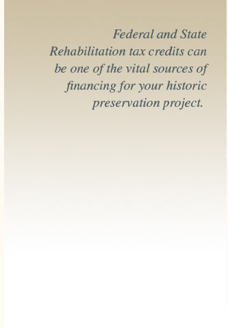 Federal and State Rehabilitation tax credits can be one of the vital sources of financing for your historic preservation project. Port City Preservation LLC provides comprehensive services related to these credits; preparing the applications for listing on the National Register of Historic Places; completing the application for project approval to the State Historic Preservation Office and the National Park Service; the initial tax credit analysis and computation, structuring of your transaction including the preliminary legal and organizational structuring, preparation of a investor presentation package, as well as assistance in the negotiation with and closing with the tax credit investor.